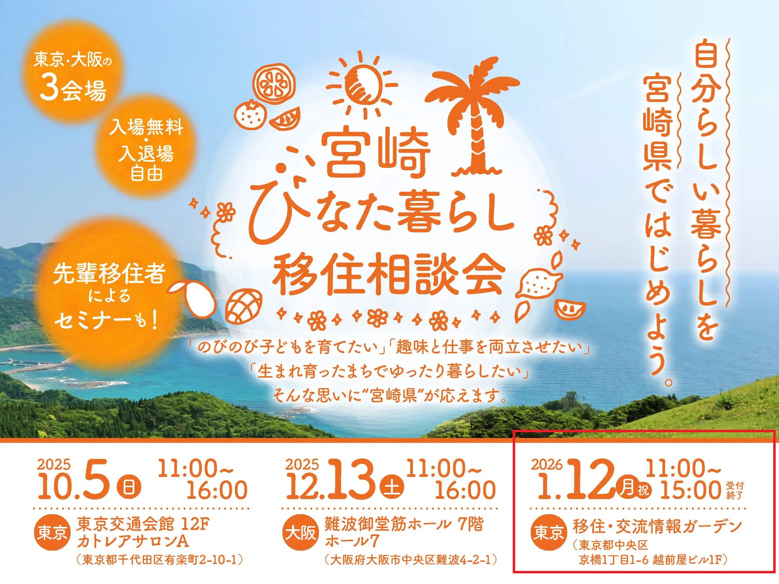 令和8年1月12日(月・祝)に東京で開催される宮崎県主催の移住相談会に参加します!